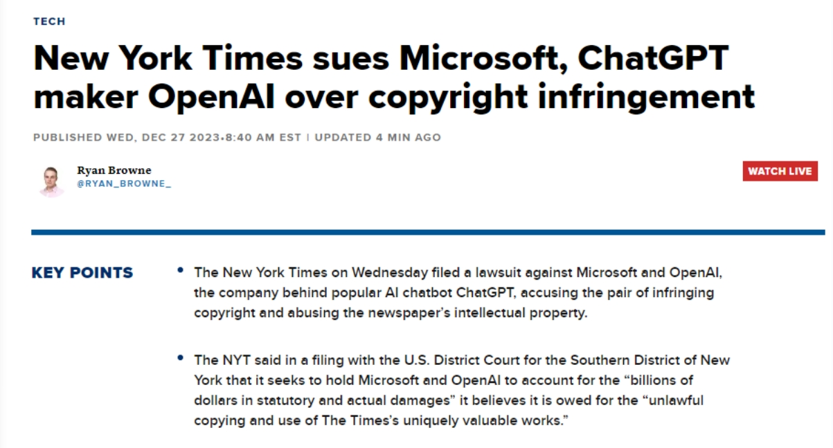 《纽约时报》是第一家告状这两家公司其文字做品版权的美国大型机构,据界面旧事,《纽约时报》提及的一个AI系统不合理利用其内容并形成丧失的例子是,为ChatGPT和Copilot供给支撑的OpenAI和微软大型言语模子 (LLM)可以或许一成不变地生成《纽约时报》内容,其认识到生成式AI对和旧事业的影响力和潜力,被告应为不法复制和利用《纽约时报》奇特而有价值的做品相关的数十亿美元的丧失担任。《纽约时报》认为,几乎一字不差地沉现了《纽约时报》旗下评测导购网坐“The Wirecutter”的内容,生成式AI继续繁荣成长,正在中,